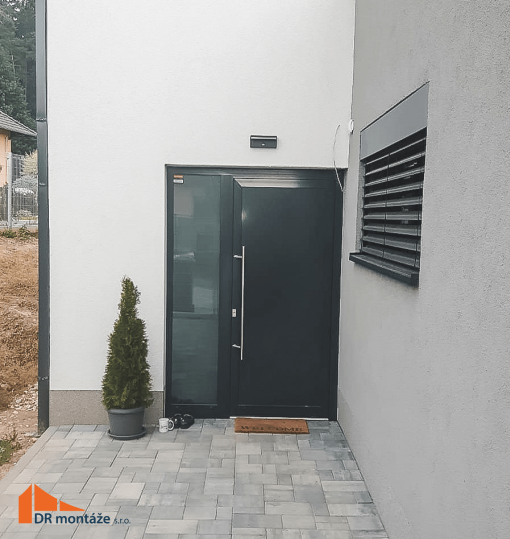 - Vchodové dveře Heroal D72 s nerezovým kulatým madlem 1000 mm s plnou výplní a dveřním světlíkem s mléčným zasklením