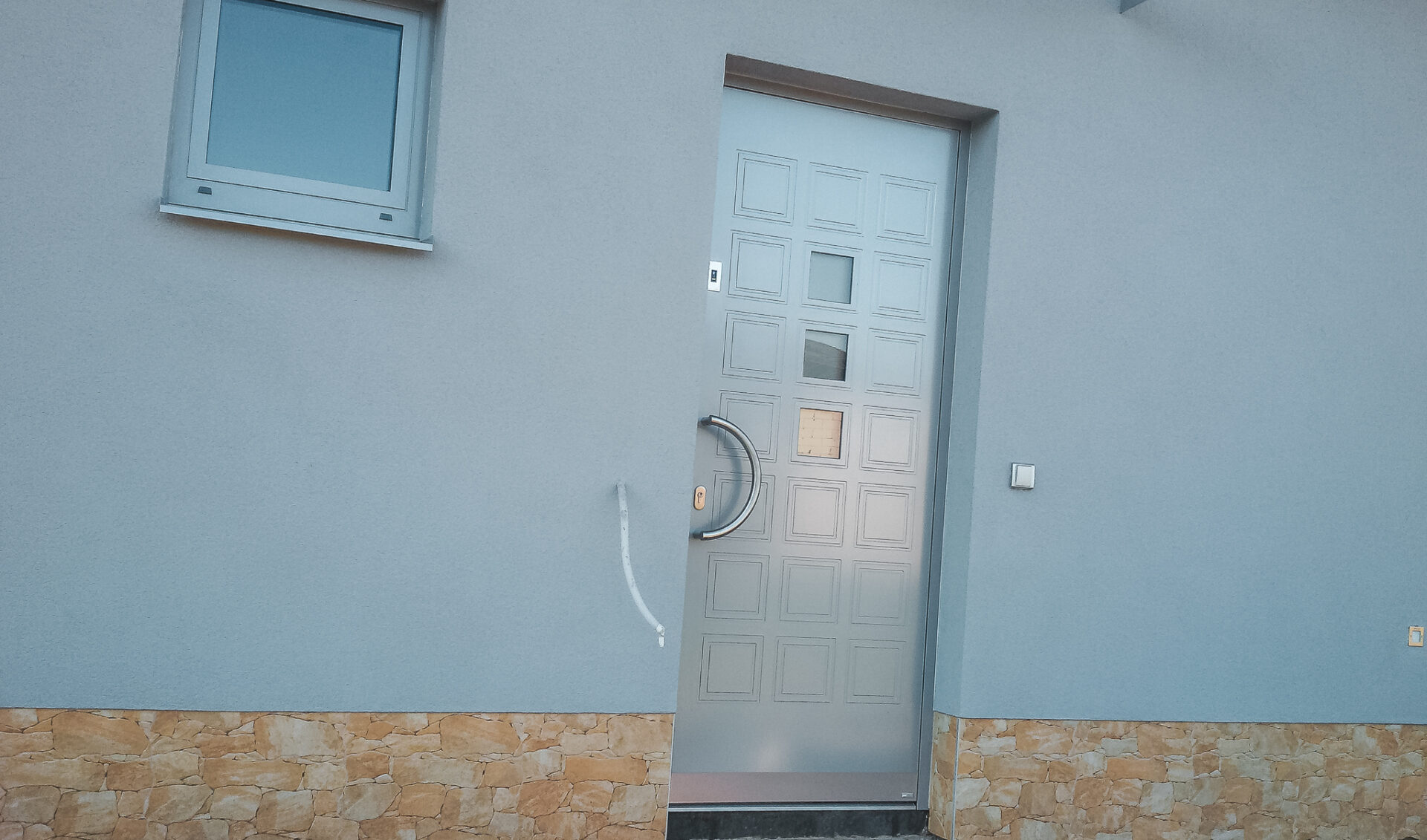- Vchodové dveře HEROAL D72, s oboustranně překryvnou výplní PERITO AD Scarlet, nerezovým madlem typ C, biometrické zamykání otiskem E-KEY